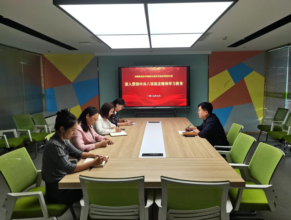 根据上级相关精神以及学校开展深入贯彻中央八项规定精神学习教育领导小组办公室的安排部署,9月19日下午,永利yl23411官网党支部在河职创新港四楼会议室开展深入贯彻中央八项规定精神学习教育集中学习。全体党员参加了集中学习。会议由永利yl23411官网副院长温宗和主持。